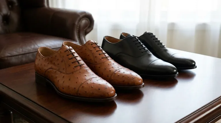 Выбор между страусиной и традиционной кожей — это выбор между выразительной, текстурной роскошью и классической, сдержанной формальностью. Страусиная кожа превосходно заявляет о себе визуально и обеспечивает превосходный комфорт, в то время как традиционная кожа предлагает непревзойденную универсальность для консервативных и профессиональных ситуаций.