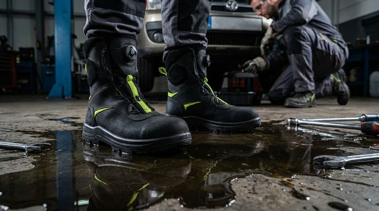 Самое важное преимущество — это улучшенное сцепление на скользких поверхностях. Стандартные резиновые подошвы могут терять сцепление при контакте с маслами или автомобильными жидкостями. Маслостойкие подошвы изготовлены из специального компаунда, разработанного для сохранения сцепления и предотвращения опасного скольжения и падений в этих конкретных условиях.