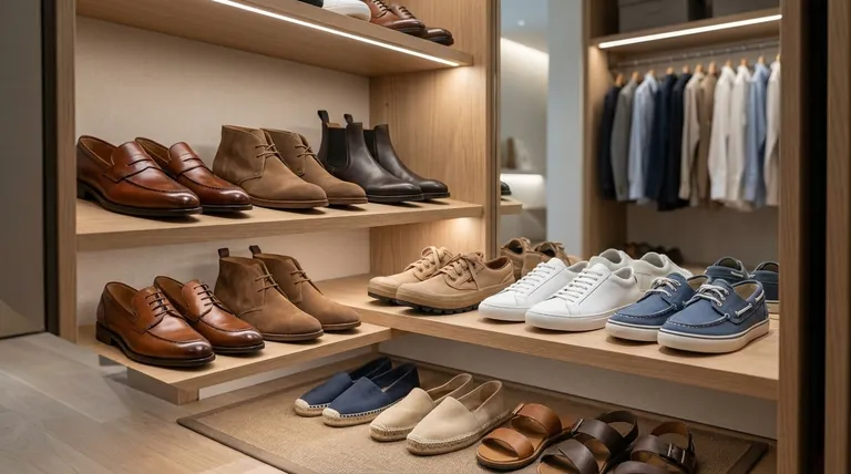 - Если ваш основной фокус — создание полной, универсальной коллекции: Ваши первые пять покупок должны охватывать весь спектр: минималистичные кожаные кроссовки, коричневые лоферы, замшевые ботинки чакка, элегантные ботинки челси и пару эспадрилий на лето.