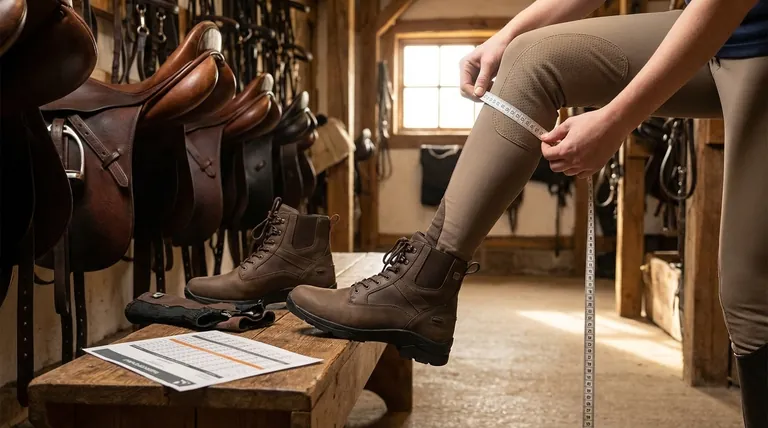 Всегда измеряйте гетры, надев обычные брюки и носки для верховой езды. Измерение на голой ноге — самая распространенная причина покупки слишком маленьких гетр.